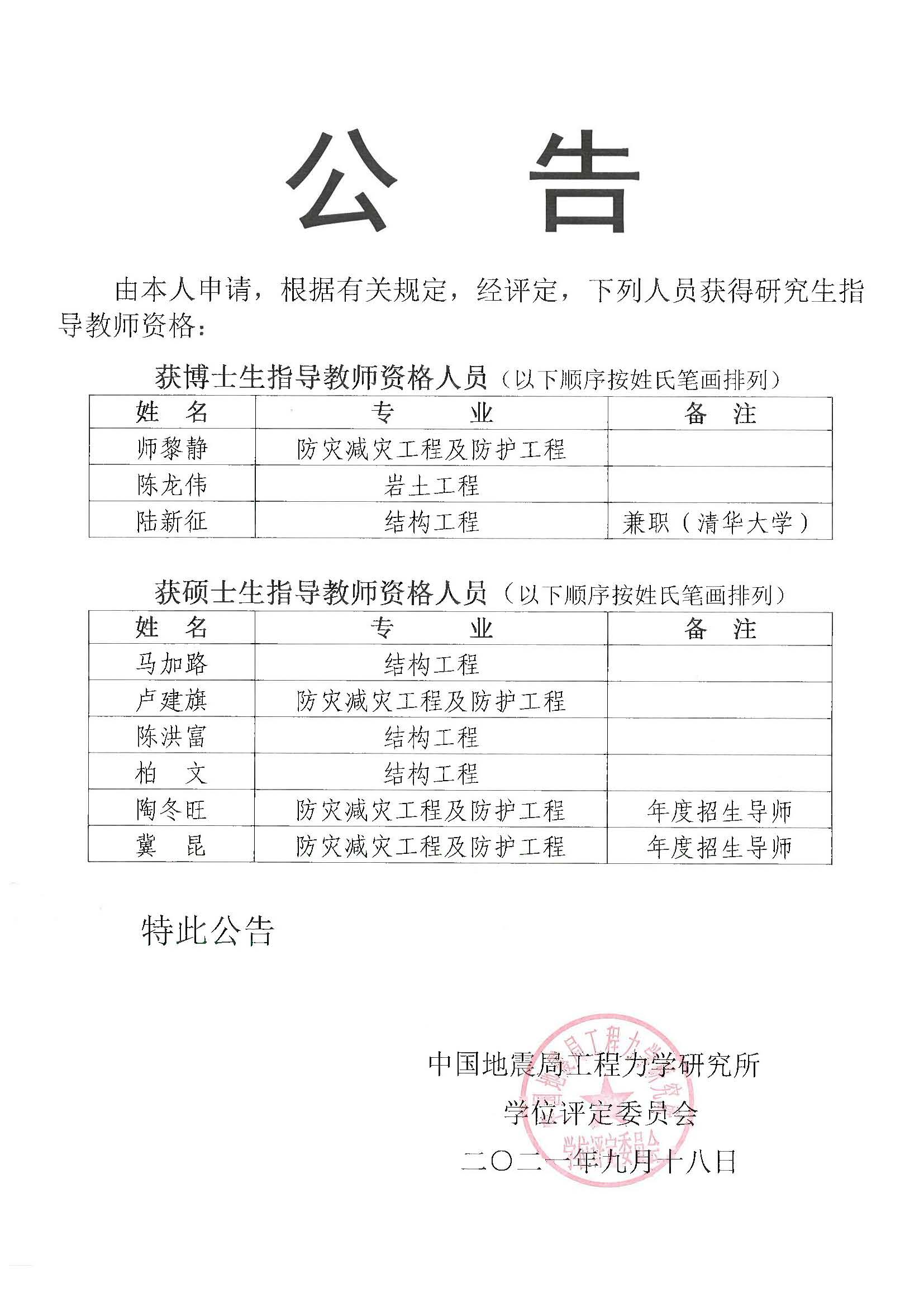 2021年研究生指導教師選聘結果公告