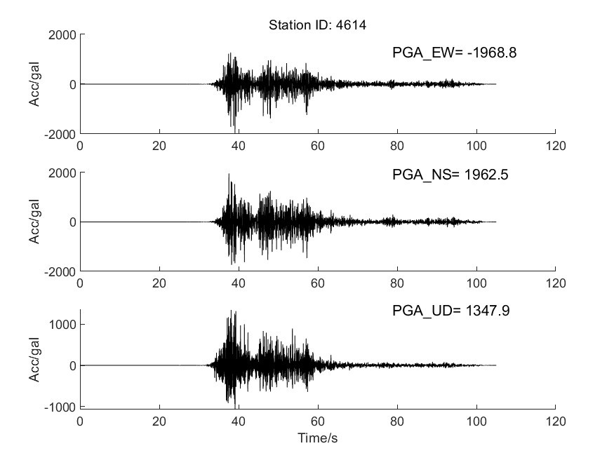 地震后強震動觀測中心收集獲取了距震中483公里范圍內強震動記錄263組,并迅速組織人員進行處理。獲取記錄臺站加速度記錄分析結果見表1(節選部分),其中4614臺PGA峰值最大,其震中距為42.4km,東西、南北、垂直向加速度峰值分別為-1968.8cm/s2、1962.5cm/ s2、1347.9cm/ s2,東西、南北、垂直向速度峰值分別為-51.3cm/s、66.8cm/s、-28.5cm/s,計算儀器地震烈度9.5度。