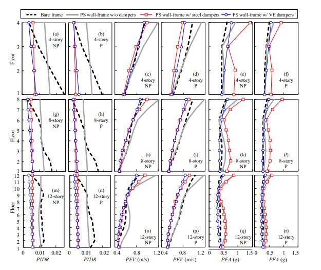 鉸支墻可以增加結(jié)構(gòu)沿高度方向的連續(xù)剛度并使層間位移分布更為均勻,從而避免框架結(jié)構(gòu)出現(xiàn)薄弱層破壞。然而,現(xiàn)有研究對鉸支墻-框架結(jié)構(gòu)的樓面速度和加速度反應(yīng)關(guān)注較少,而這些反應(yīng)主導(dǎo)了建筑物非結(jié)構(gòu)構(gòu)件的地震損傷。本文通過數(shù)值模擬評估了鉸支墻-框架結(jié)構(gòu)的樓面速度和加速度反應(yīng),重點研究了使用不同類型阻尼器對其的影響。此外,還通過結(jié)合最大峰值層間位移角、平均峰值樓面速度和平均峰值樓面加速度作為工程需求參數(shù)進行了多維地震易損性分析。
