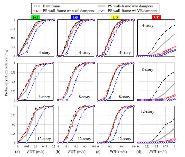 本文通過非線性時程分析和多維地震易損性分析,研究了兩種阻尼器(即摩擦型阻尼器和黏彈性阻尼器)在減小鉸支墻-框架結(jié)構(gòu)層間位移、樓面速度和加速度地震反應(yīng)中的作用??梢缘玫揭韵陆Y(jié)論: