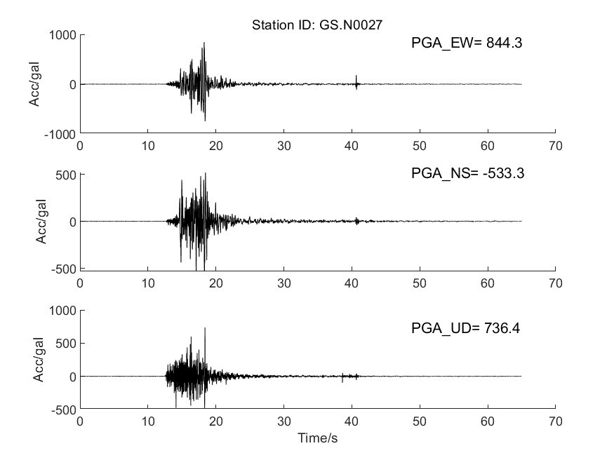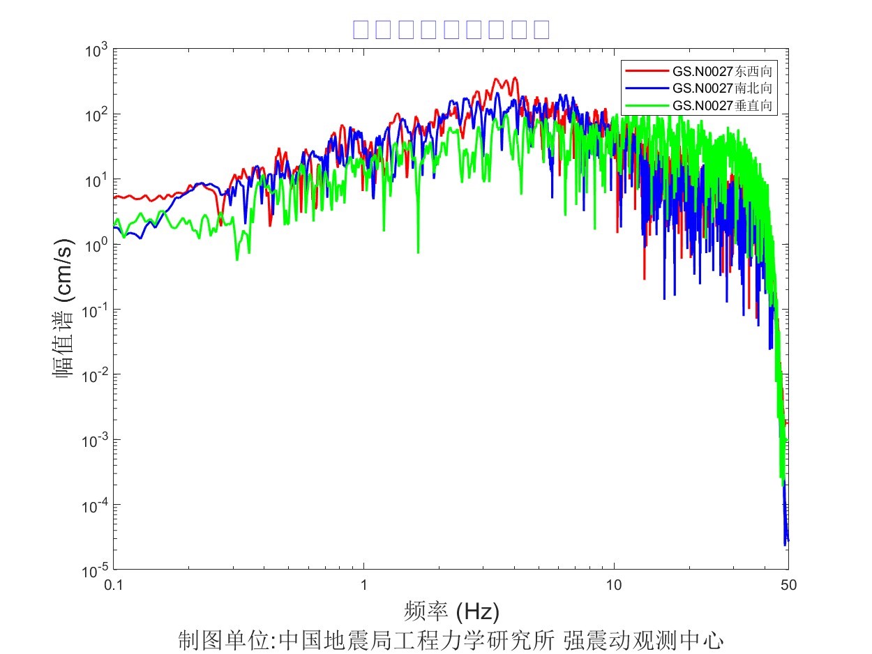 地震后工力所強(qiáng)震動(dòng)觀測(cè)中心共收取距震中100公里范圍內(nèi)實(shí)時(shí)強(qiáng)震儀記錄57組、烈度儀記錄182組。中心立即組織人員進(jìn)行處理。獲取記錄臺(tái)站加速度記錄分析結(jié)果見表1,其中GS.N0028 臺(tái)烈度最大,其震中距為13.6km,東西、 南北、 垂直向加速度峰值分別為 905.8cm/s2、778.5cm/ s2、-702.4cm/ s2,東西、南北、垂直向速度峰值分別為57.3cm/s、-52.1cm/s、-16.3 cm/s,計(jì)算儀器地震烈度9.5度。GS.N002B 臺(tái)峰值加速度最大,其震中距為12.3km,東西、 南北、 垂直向加速度峰值分別為 1071.4cm/s2、856.8cm/ s2、796.1cm/ s2,東西、南北、垂直向速度峰值分別為-30.7cm/s、-21.5cm/s、-10.1 cm/s,計(jì)算儀器地震烈度9.2度。GS.N0027臺(tái)震中距最小,其震中距為5.8km,東西、南北、垂直向加速度峰值分別為823.9cm/s2、-533.3cm/ s2、 692.7cm/ s2,東西、南北、垂直向速度峰值分別為-39.8cm/s、-28.9cm/s、-11.3 cm/s,計(jì)算儀器地震烈度8.8度。儀器地震烈度分布圖見圖1,地震峰值加速度分布圖見圖2,地震峰值速度分布圖見圖3,地震加速度反應(yīng)譜(T=0.3s、T=1.0s、T=3.0s)分布圖見圖4、圖5、圖6,GS.N0028 臺(tái)強(qiáng)震動(dòng)記錄見圖7,GS.N0028臺(tái)加速度反應(yīng)譜見圖8,GS.N0028臺(tái)傅里葉幅值譜見圖9,GS.N002B臺(tái)強(qiáng)震動(dòng)記錄見圖10,GS.N002B臺(tái)加速度反應(yīng)譜見圖11,GS.N002B臺(tái)傅里葉幅值譜見圖12,GS.N0027臺(tái)強(qiáng)震動(dòng)記錄見圖13,GS.N0027臺(tái)加速度反應(yīng)譜見圖14,GS.N0027臺(tái)傅里葉幅值譜見圖15。
