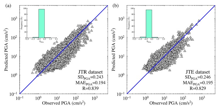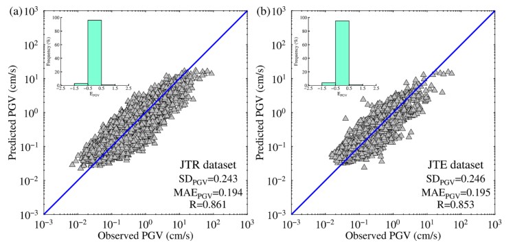 (1)我們提出了一個結合了循環神經網絡和遷移學習的深度學習方法去提高中國儀器地震烈度預測的魯棒性?;谘h神經網絡的變體雙向門控單元(BIGRU)和日本K-NET臺網記錄的強震動數據建立現地PGA預測模型(R-PGA)和現地PGV預測模型(R-PGV)。然后,通過遷移學習,凍結R-PGA模型和R-PGV模型的BIGRU模塊,基于中國地震臺網記錄的強震動記錄對R-PGA模型和R-PGV模型重新進行訓練和微調,建立了經遷移后的PGA預測模型(TLR-PGA)和PGV預測模型(TLR-PGV)。我們對TLR-PGA模型和TLR-PGV模型的預測結果和基線模型進行了比較,同時還分析了基于TLR-PGA模型和TLR-PGV模型得到的現地儀器地震烈度和警報情況。