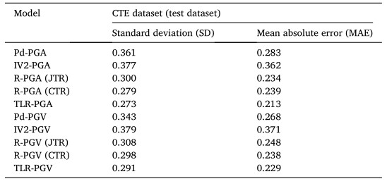 (3)對于相同的中國測試數據集,在P波到達后3秒,表1展示了基于TLR-PGA模型、TLR-PGV模型和基線模型的預測結果。從表1中可以發現:和傳統PGA和PGV預測方法以及未使用遷移學習的神經網絡模型,基于TLR-PGA模型和TLR-PGV模型可以獲得誤差更小的PGA和PGV預測結果。這也說明:本文提出基于循環神經網絡和遷移學習方法對于中國儀器烈度預測是可行的。