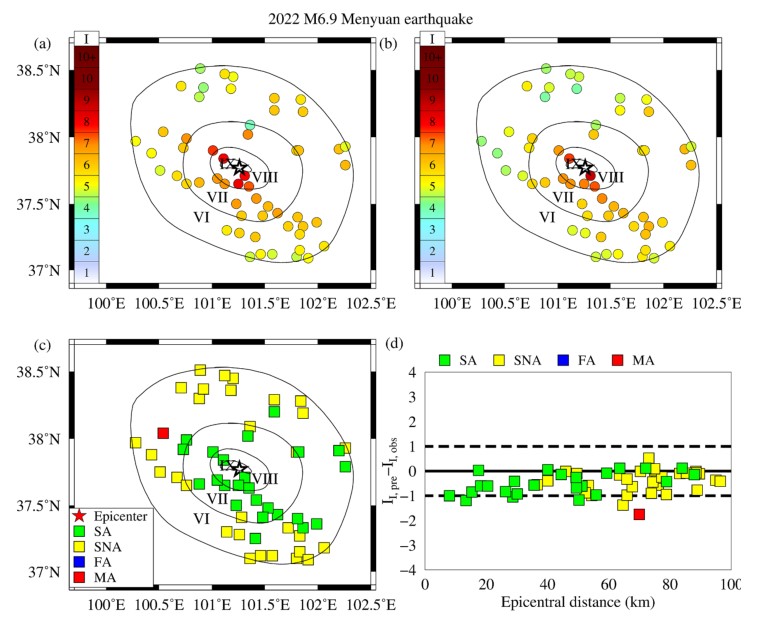 (4)為了驗證本文提出的方法的魯棒性,我們將該方法應用到中國訓練數據集和測試集之外的五次破壞性地震事件中?;诒疚奶岢龅姆椒ǎ赑波到達后3秒,圖3展示2022年門源6.9級地震的儀器地震烈度預測結果及警報性能。從圖3中可以看到:預測的儀器地震烈度和觀測地震烈度是非常接近的,且基于預測的儀器地震烈度,只發生了一次漏報,且沒有誤報現象。同時,圖4展示了這五次破壞性地震事件的儀器地震烈度預測誤差和警報情況。從圖4中可以發現:P波到達3s后,儀器地震烈度預報誤差主要在±1以內,平均絕對誤差為0.78;成功報警的比例達到90%,誤報警的比例為0%。研究表明:本文的研究對于現地地震預警是有幫助的。