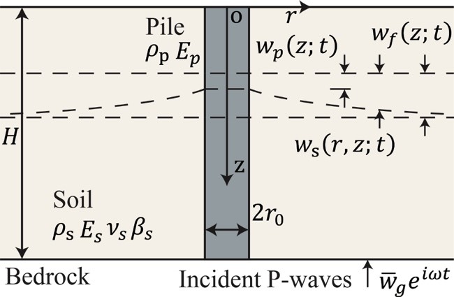 樁-土相互作用使得樁基礎的地震響應非常復雜。由于樁基礎的抗震性能直接決定了受支上部結構的安全性。因此,研究樁-土體系的地震響應是十分必要的。國內外的學者針對樁-土體系的解析方法進行了大量的研究(如,BDWF模型、改進Vlasov模型等)。改進Vlasov模型通過采用精確的樁土阻力,極大地改進了BDWF模型,但由于在求解過程中采用了迭代逼近,仍然不能提供嚴格的解析解。本研究的主要目的是推導端承樁豎向運動響應的嚴格解。與BDWF模型和改進Vlasov模型相比,本模型具有更簡潔、明確的物理意義。并且在給出嚴格解的基礎上,對樁土參數對樁土系統動力響應的影響進行了參數化研究。
